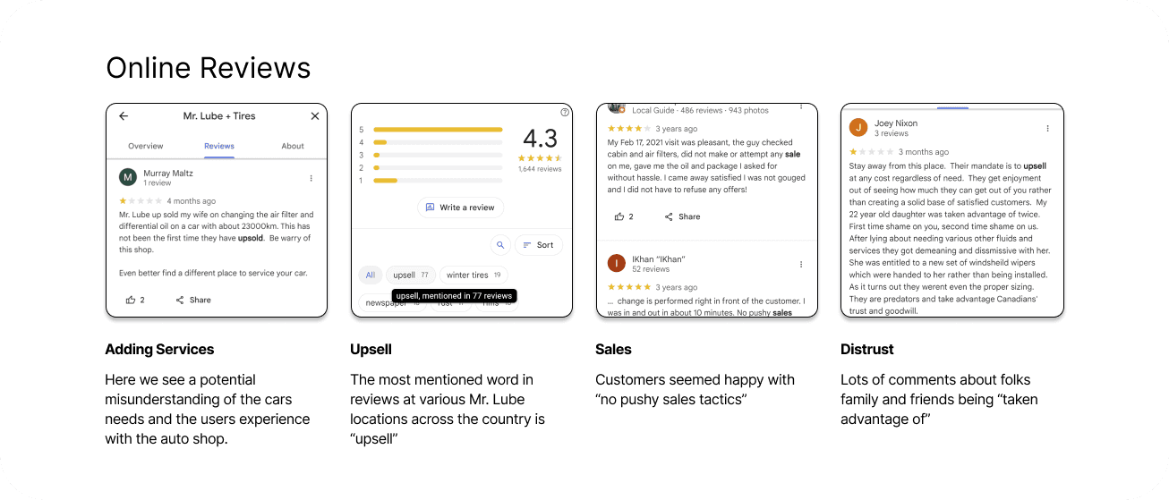 To accommodate the project’s tight timeline and to confirm my suspicions that there was room for improvement, I conducted qualitative user research by reviewing online customer feedback for auto repair shops across the country. Across these reviews, the most frequently mentioned theme was “upsell,” often framed negatively. While some customers explicitly praised locations for having “no pushy sales tactics,” many others expressed distrust, sharing stories of friends or family members feeling taken advantage of.