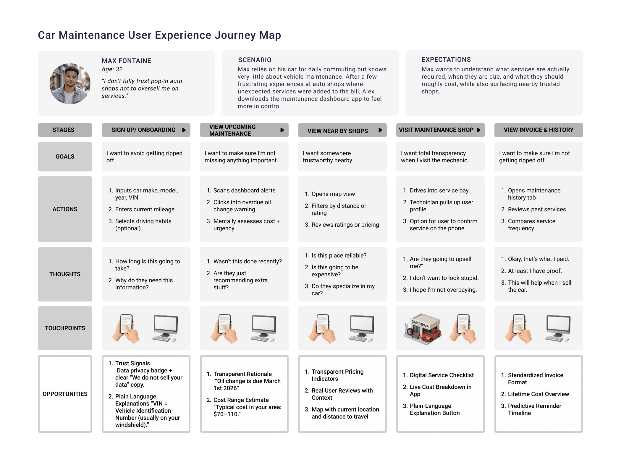 The biggest tension point is at and after service, where unclear information and unexpected recommendations can create doubt. The opportunity is to connect the digital experience with the in-person visit, giving drivers better context before they arrive and more transparency during service.